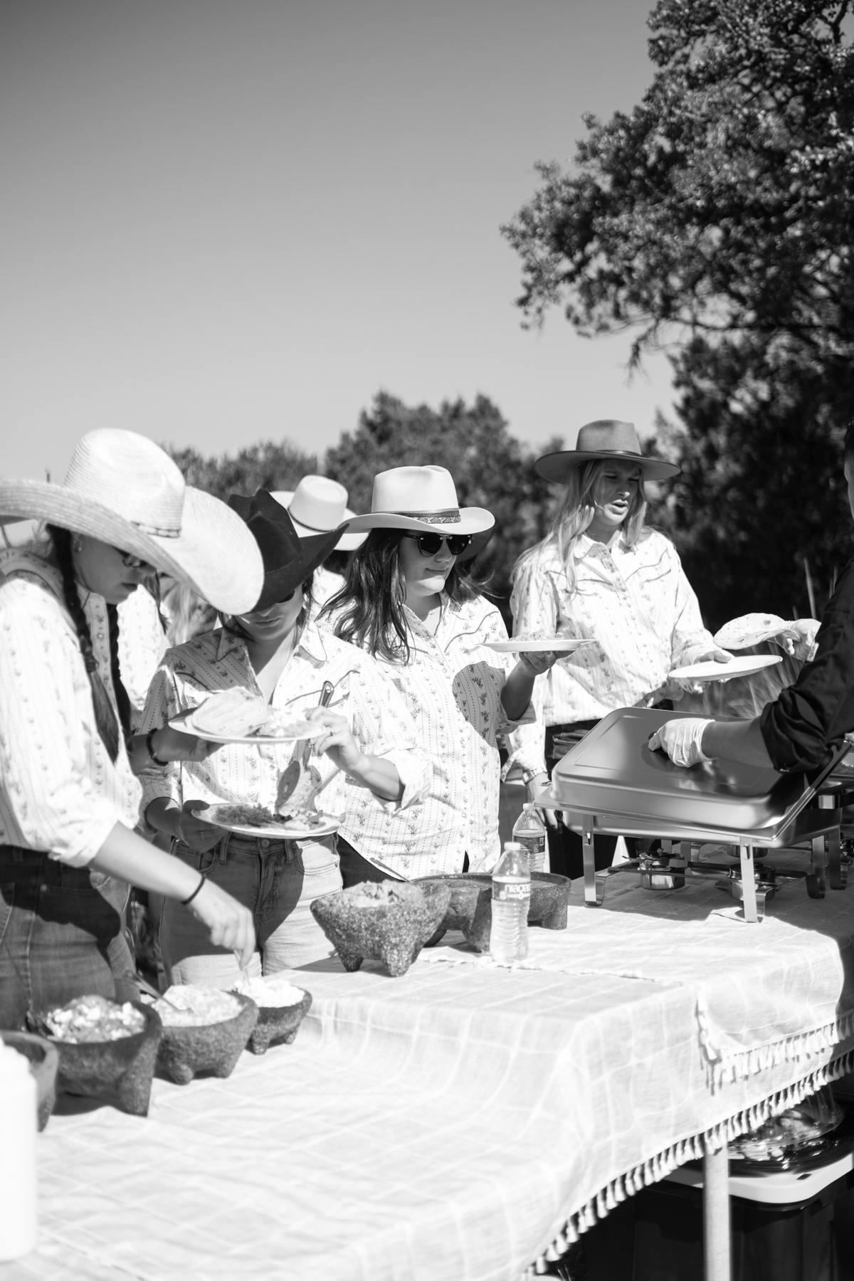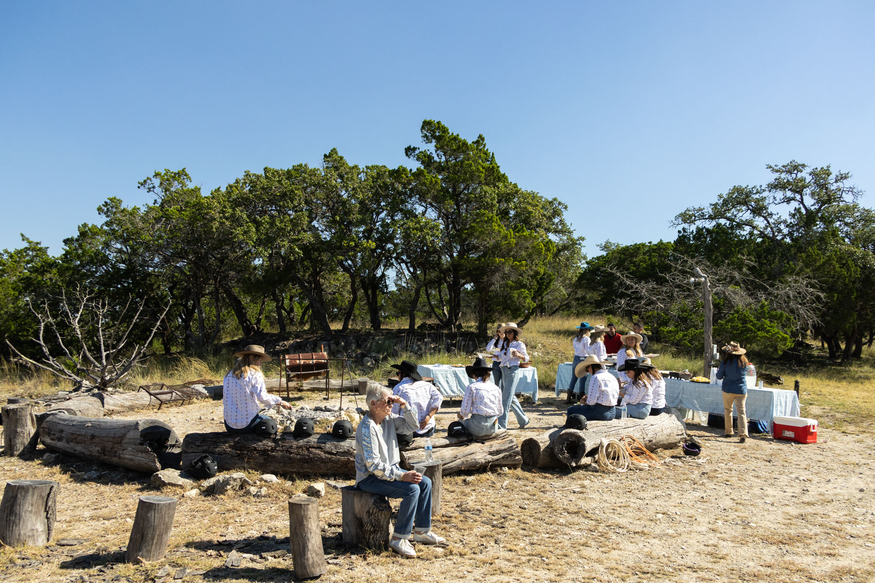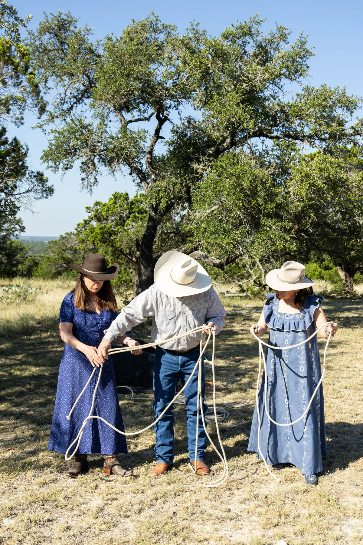Dressed in effortlessly cool Western-inspired styles (think boots, denim, and breezy button-downs) the group rode beneath the wide Texas sky, shared laughs during roping lessons, and came together for a beautifully curated outdoor lunch that felt like a scene from a modern ranch retreat. Bathed in warm sunlight and filled with easy, joyful conversation, this gathering was the perfect pause before the weekend’s festivities unfolded.