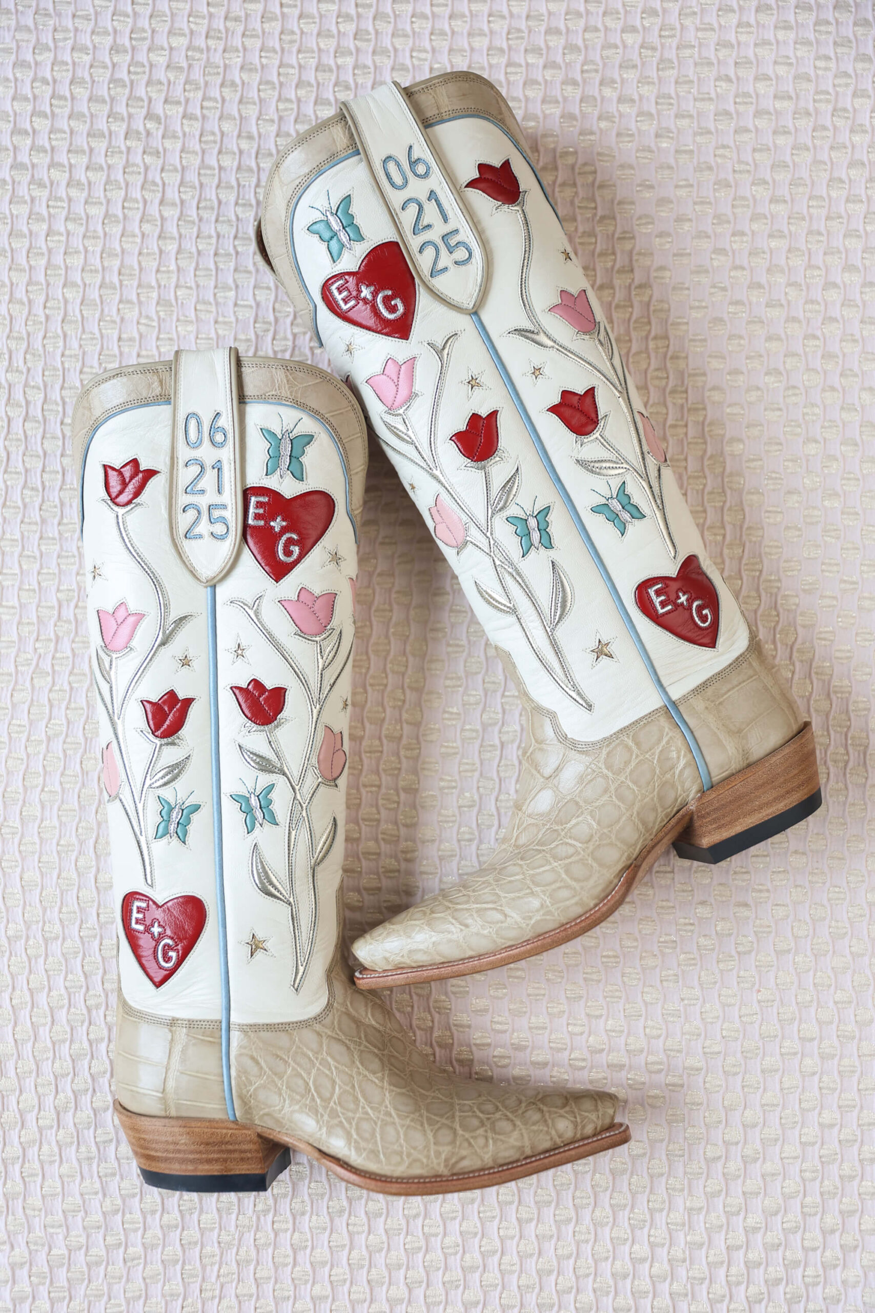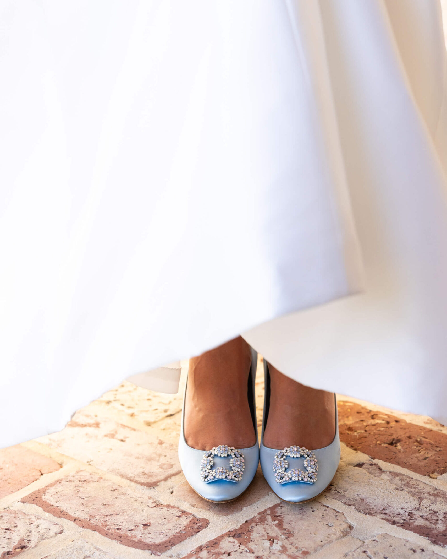 - Shoes hat pop – Think metallic heels, pearl-embellished slingbacks, chic sneakers, colorful platforms, or even a bold bridal pair of boots.